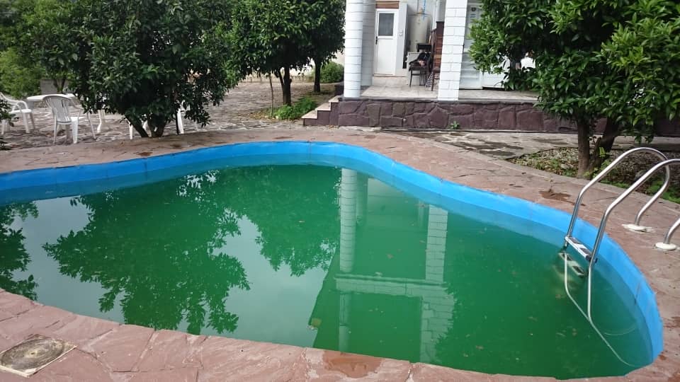 تمامی کفپوش های ویلا ترکیبی از سنگ فرش و شن می باشد و بین درختان به طور کامل اسپار شده و تمیز است. استخری در وسط حیاط قرار گرفته که با درختان زیبا و سایه دار در کنار آن زیبایی دو چندان می دهد. علاوه بر این سایه درختان باعث می شود آب استخر در تابستان هم خنک باشد و هیچ گونه دیدی از خارج از ویلا به استخر وجود ندارد.