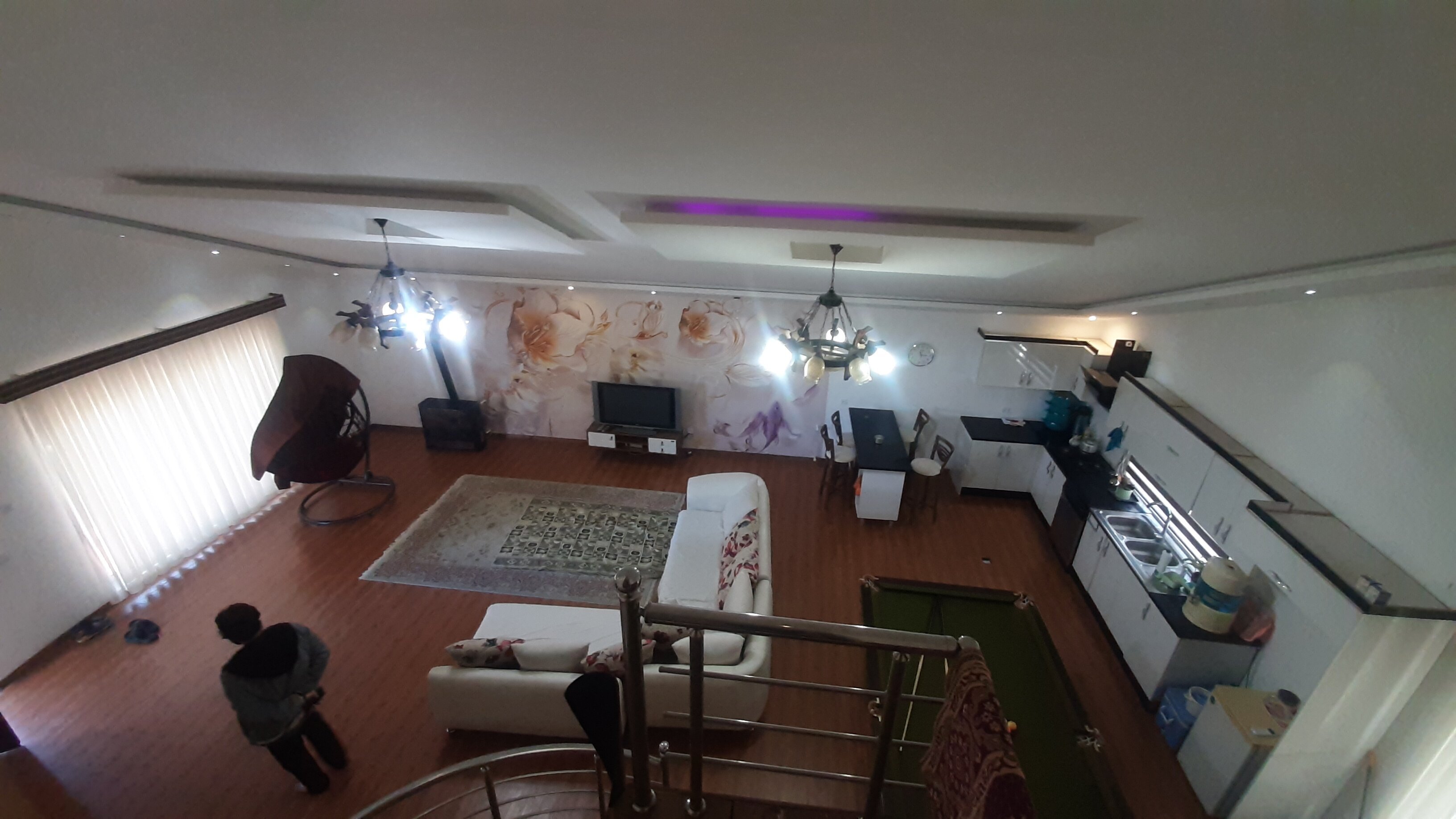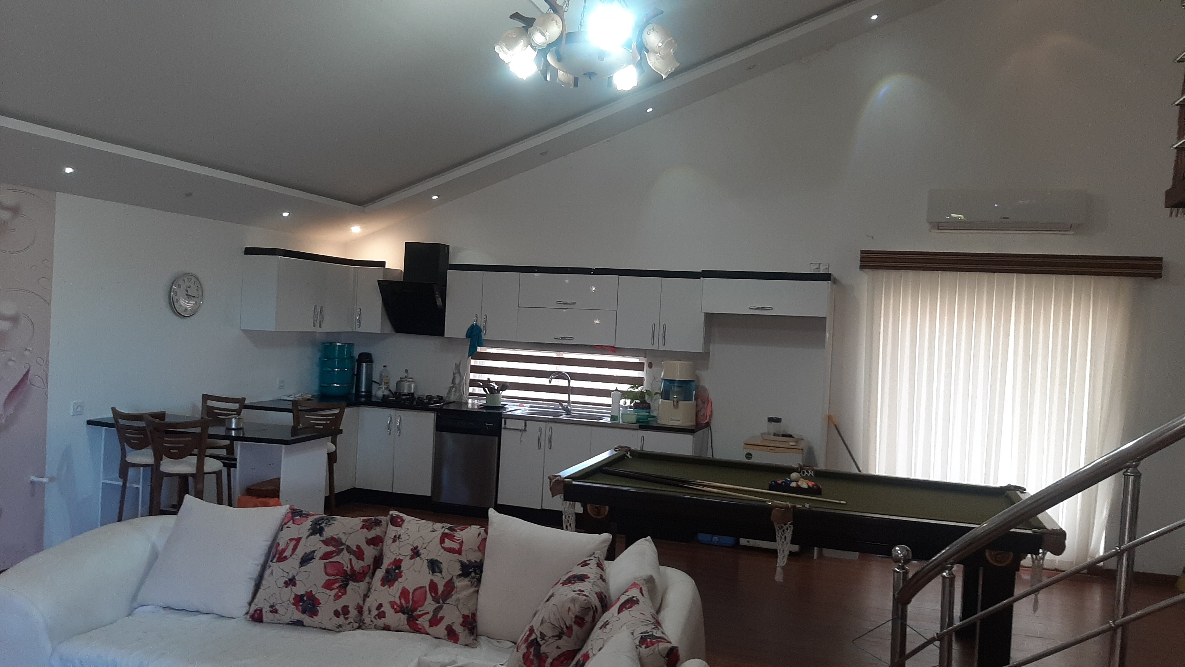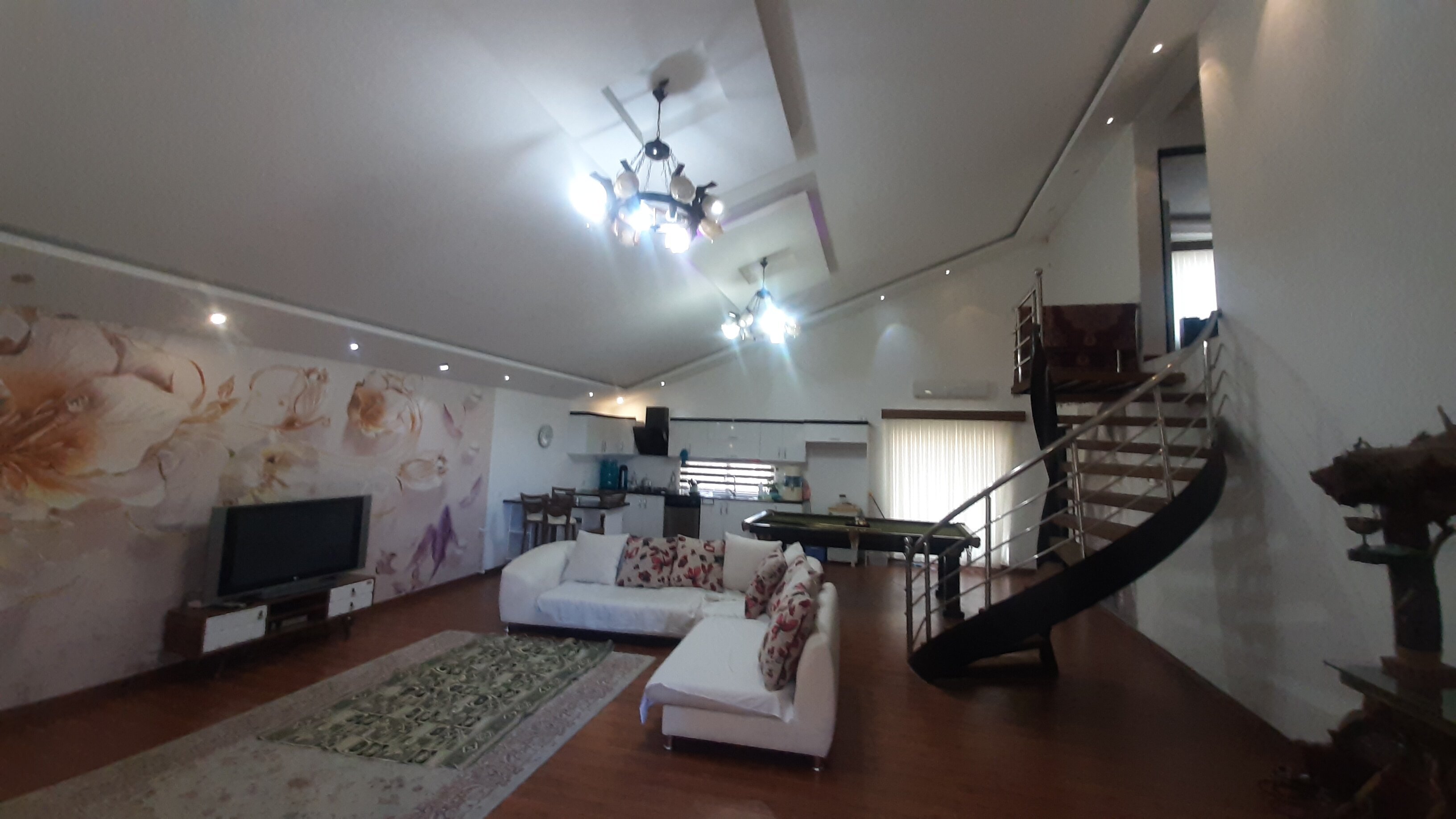 همچنین پله برای رفتن به طبقه اتاق خواب ها در وسط پذیرایی قرار گرفته اند که خود آنها زیبایی بی نظیری دارند. سقف های ویلا کنف شده با نورهای رنگی هستند که ساختمان را با نور پردازی عالی زیباتر نشان داده است. تمامی پنجره های ویلا دو جداره هستند و هیچ گونه صدایی از خارج ویلا به داخل وارد نمی شود و آرامش ویلا کاملاً تامین است. در داخل ویلا امکانات ورزشی هیجانی و سالم جا گیری شده است و شما می توانید با میز اسنوکر ویلا بازی زیبا با دوستان و خانواده برای خود رقم بزنید.