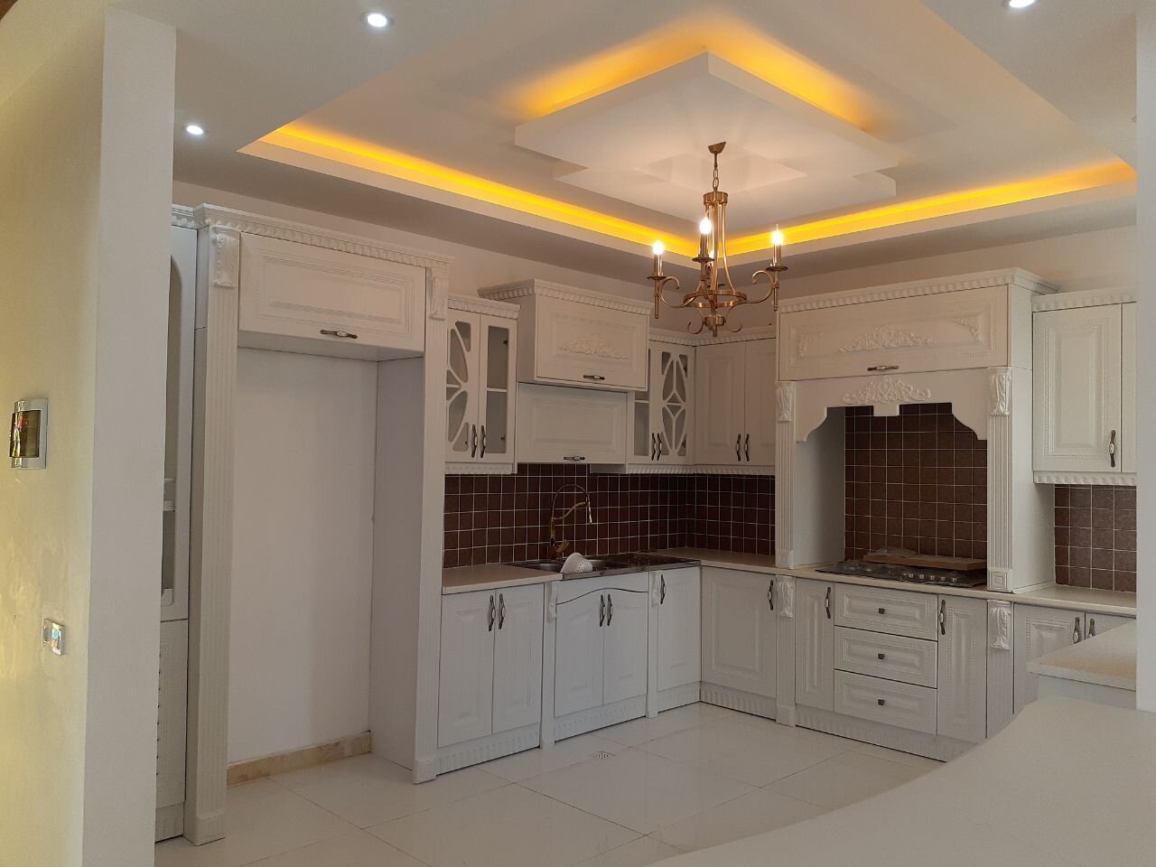 چرا که نور پردازی، کاشی کاری دیوار ها، قرار گیری لوستری شیک و زیبا و وجود کابینت های جا دار و سفید رنگ هارمونی بی نظیری با سرامیک های کف آشپزخانه ایجاد کرده که ظاهری تمام عیار و شیک به آشپزخانه این ویلا بخشیده است و شما را مسخ خود می کند.